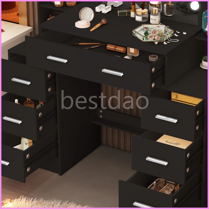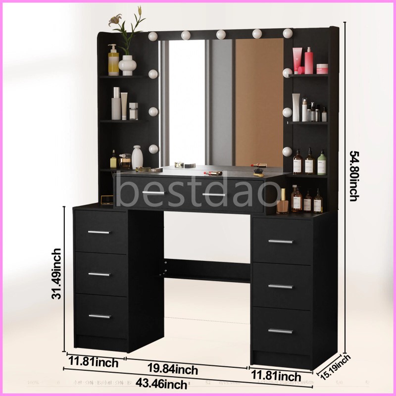Yamissi Makeup Vanity Desk with Mirror & LED Lights Dressing Table with 7 Drawers Black