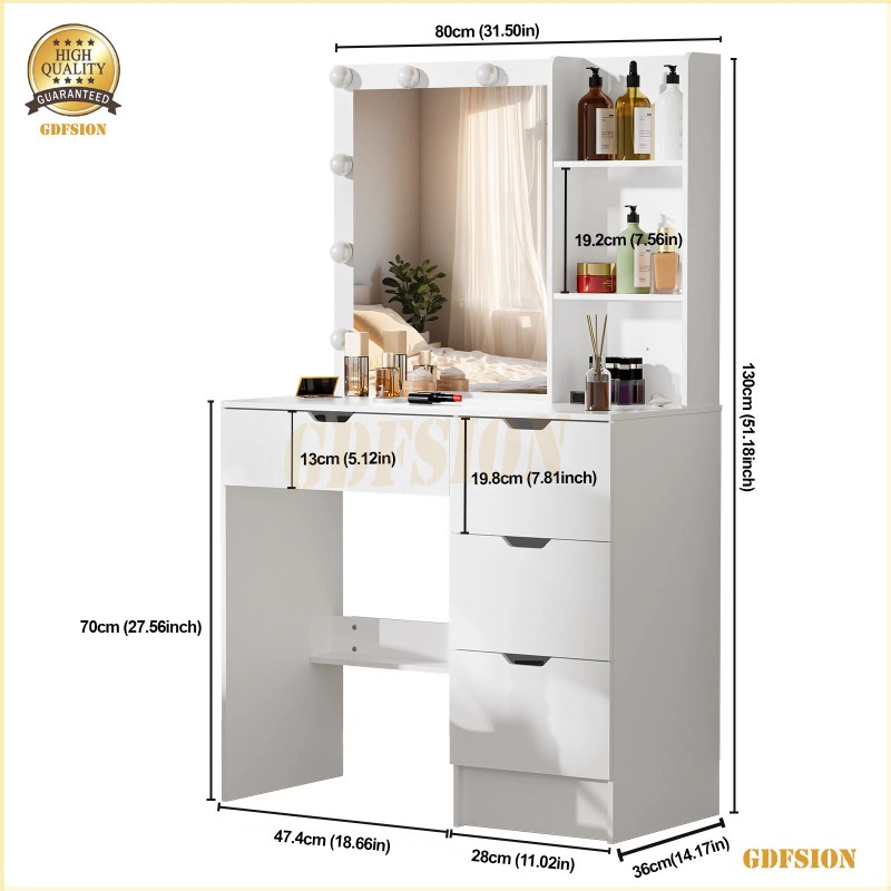 Vanity Table Makeup Dressing Desk With LED Mirror And 4 Drawers & Cut Pull White Specification: -Colour: Warm White -Material: MDF -Overall Dimension : 80 x 36 x 130 CM/ 31.5'' x 14.2'' x 51.1''(L x W x H) -Mirror Dimension: 60 x 50 CM/ 23.6 '' x19.7 ''(L x H) -Built -in Hollywood Bulbs which Hidden Wires for better Aesthetics -It comes with a large mirror And 3 Storage Shelves , 4 drawers & Cut Handle Pull Package includes: 1 x Dressing Table Set 1x Mirror & 10 LED Bulbs (with wire) 1 x Instructions NOTE: It comes without the vanity stool ! |