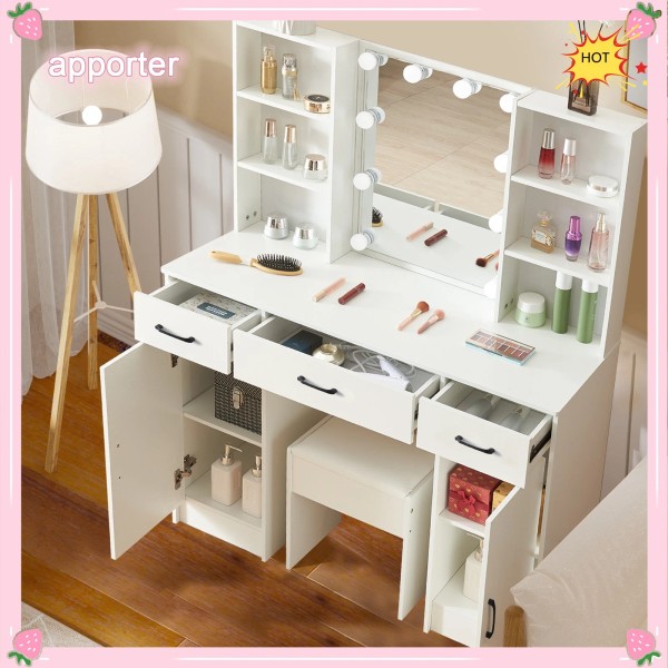 【Powerful Storage Function】This vanity with lights and mirror desk and stool have 3 drawers,6 shelves and 2 storage cabinets, enough space for all makeups, jewelry, hair accessories, blow dryer.it means no more lost cosmetics.