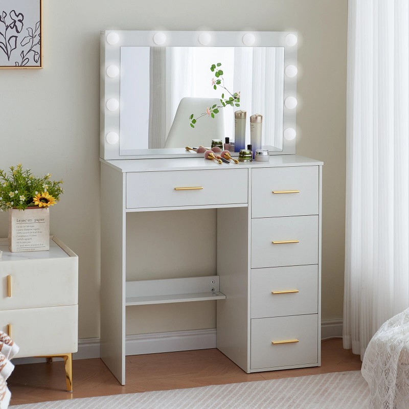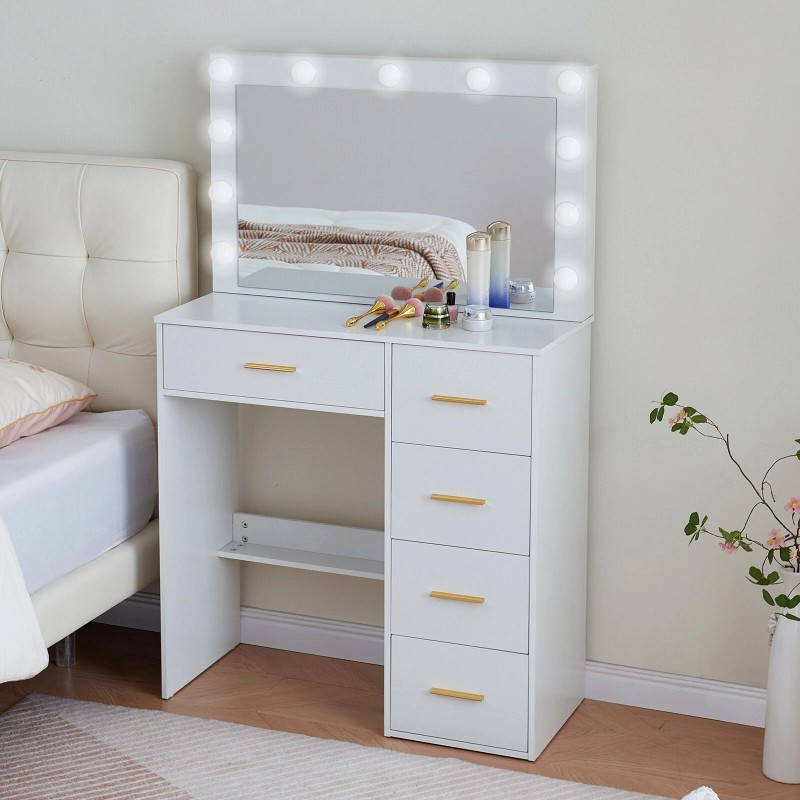 White Vanity Desk with LED Lighted Mirror and 5 Drawer,3 Color Adjustable Lights Features 1.Adjustable Lighting with 3 Modes: 11 LED lights with 3 different settings: warm yellow, warm white and cold white, make this vanity dresser more beautiful. With the switch, you can easy to change the color mode, or adjust the brightness by press and hold the switch. 2.Ample Storage Space: Includes 1 large drawers and 4 small drawer, ensuring plenty of room to organize your cosmetics and accessories. 3.Detailed Installation Instructions: Each package comes with step-by-step assembly instructions, with all parts and accessories clearly labeled for hassle-free setup. Specification: Style:Morden Features: Flat Pack,With Led Mirror Colour: Warm White with Golden Handles Material: MDF Overall dimension: 80 (L) x 36 (W) x 130 (H) cm / 31.5 (L) x 14.1(W) x 51.2 (H) inch Mirror: 80 (L) x 50 (H) cm / 31.5 (L) x 19.7 (H) inch Package includes: 1 x Dressing Table 1 x Instructions |