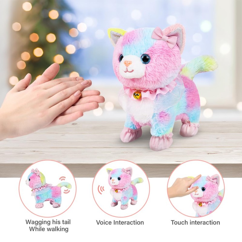 - Educational toy: Have fun with your lifelike pet, let your children experience the fun of raising pets. Companion toy cat. When your babies talk to cat or touch their head slightly, it can also bark and wag its tail and head.