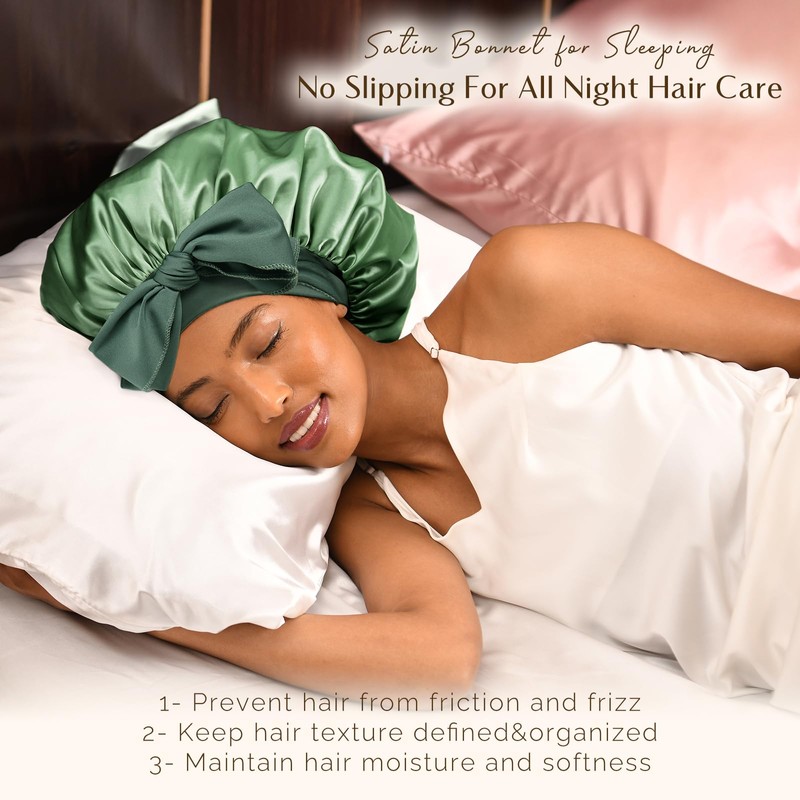 - 【A Butter Satin Bonnet】: Exclusive high quality long filament satin fabric, ultra softer, luxury feel, as smooth as butter. Like the function and texture of silk, satin made wearings are good for our skin and hair while we sleep. It reduces the friction and leaves your skin and hair hydrated which is the key to reduce hair breakage, bedhead, split ends, and dry skin.