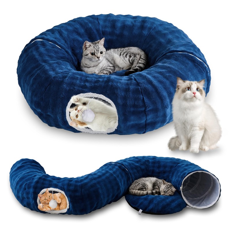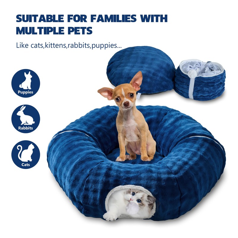 - Versatile Cat Tunnel: Unlike normal single S-shaped or T-shaped tunnels, this cat bed tunnel consists of two semi-circular tunnels and a round soft cushion. This design allows pets to freely switch between entertainment and rest. It can perfectly accommodate small pets up to 15 pounds such as cats, rabbits, or ferret. Pets can immediately have a cozy and peaceful place to rest after exciting games. Perfect for families with multiple furry pet friends. Not just a toy, but also a bed