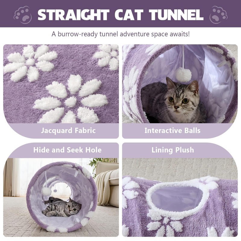 Yaning Straight Cat Tunnel for Indoor Cats 47"x12", Cute Cat Toys Collapsible Tunnel Tube with Balls for Puppy Kitten Rabbit, Purple Flower