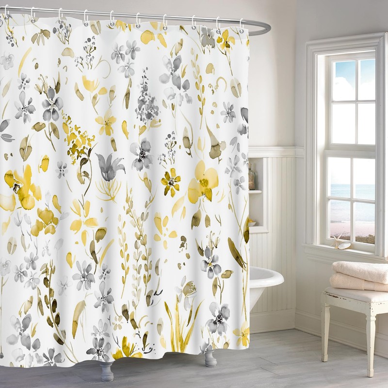 Yanutan Yellow Gray Floral Shower Curtain,Watercoor Flower Leaves Shower Curtain Set for Bathroom,Yellow and Gray Plants Fabric Bath Curtain with Hooks, 72x72in