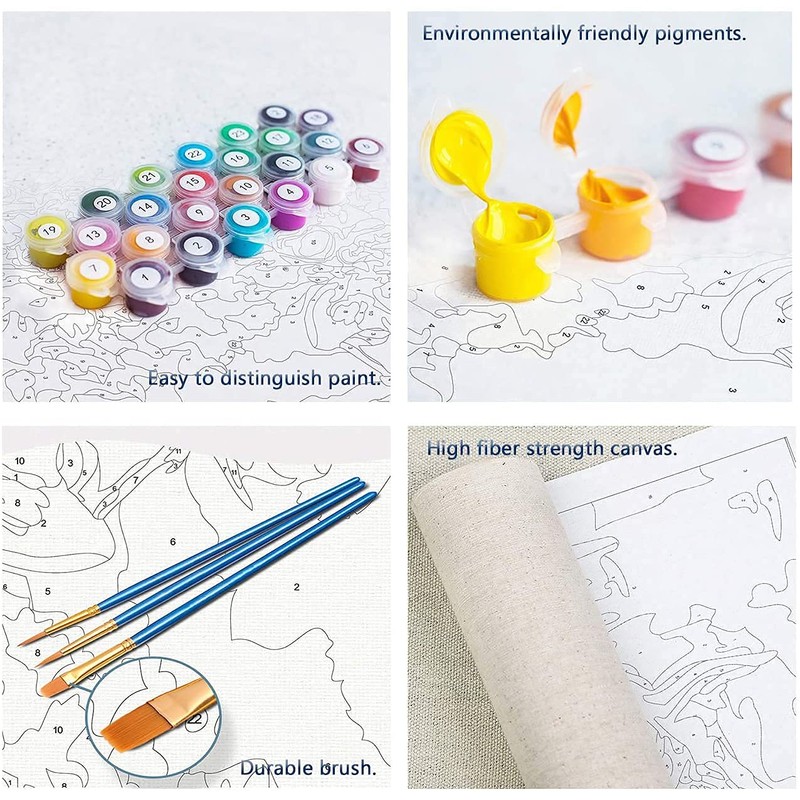 - High-quality paint and canvas: the paint is non-toxic, safe and high-quality acrylic paint. They are environmentally friendly pigments with high brightness, bright colours, high concentration and no water. The canvas we provide is a two-tone printed canvas that easily protects the eyes with paint by numbers. The professional canvas has a clear texture and is easy to colour.