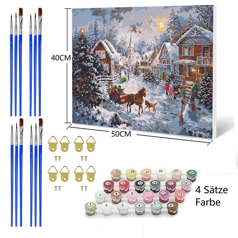 - 4 x painting by numbers children: contains 4 pre-printed textured oil paintings (without borders), 4 sets of colour and 12 brushes. The canvas size is 40 x 50 cm.