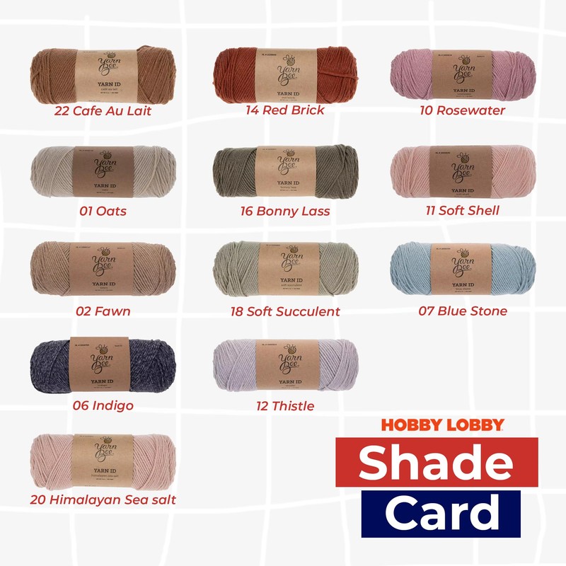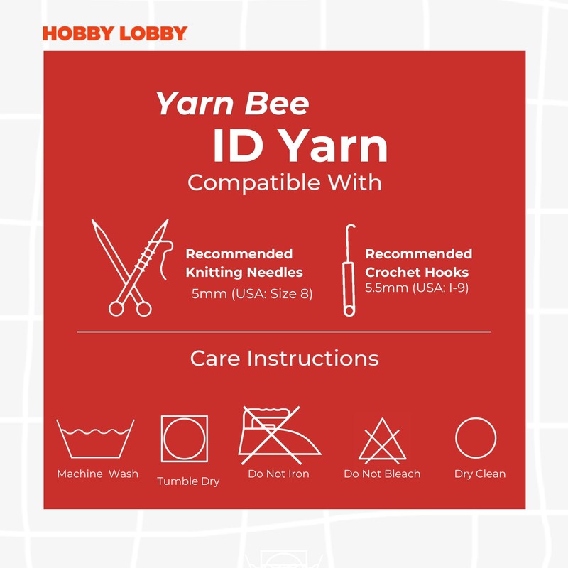 Hobby Lobby Yarn Bee - Medium Hand Knitting Yarn Skein: Don’t reach your knit’s end! Yarn Bee brings you a soft and beautiful yarn knitting and crocheting skein that will suit your DIY craft needs. This Medium crochet yarn soft skein is 252 Yards long and will provide a smooth at-home knitting experience. Made from soft and luxurious 80% Acrylic & 20% Polyamide, you can use it as a yarn for baby accessories and apparel, for hats, afghans, or as a blanket yarn for knitting. To keep the yarn soft and avoid shedding or bleeding its color, Machine Wash (Warm), Tumble Dry (Normal), Do Not Iron, Do Not Bleach, Dry Clean (Any Solvent). --- Suggested Tools: Recommended Knitting Needles: 5mm (USA: Size 8) Knit Gauge: 18 Stitches x 23 Rows = 4" x 4" Recommended Crochet Hook: 5.5mm (USA: I-9) Crochet Gauge: 12 Single Crochet x 15 Rows = 4" x 4" --- About Us: Hobby Lobby offers over 70,000 items featuring home decor, seasonal decor, tableware, floral, art supplies, craft supplies, yarn, fabric, jewelry making, hobbies, and much more. What began as a $600 start-up, continues to grow and expand–enabling customers nationwide to live a creative life.