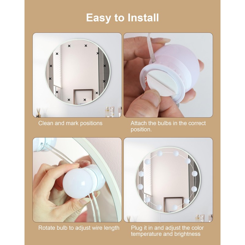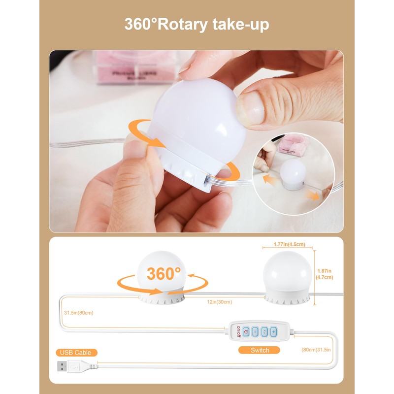- 【Wire Length Adjustable】 The cord length between each bulb can be concealed within the base by rotating the bulb's cord-retracting mechanism to achieve the optimal DIY look while maintaining the mirror's cleanliness and elegance. It is compatible with mirrors of all shapes and sizes.