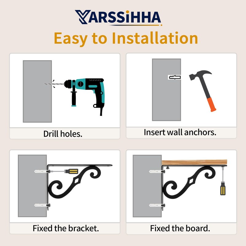 Installation Guideline: Comes with all installation hardware (Board is NOT included): 6 pcs 8 inch wall mounted shelf brackets, 12 long screws, 12 short screws as well as 12 anchors, the shelving brackets are quick and easy to install. Brackets for shelves can be used on most walls, such as cement wall, ceramic tile wall, brick wall, solid wall.