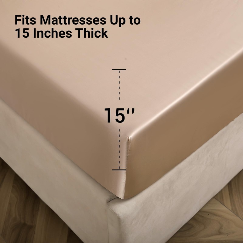 - Champagne Imitated Silk Fitted Sheet: Plain mattress cover classic design add an extra layer of stylish and fresh to your room and coordinate with modern,naturalistic,or other decorative elements. A satin single sheet only is the perfect bedding for people who love to keep cool. The fabric's ultra-breathable keeps you cool and comfortable. The ultra-soft satin deep fitted sheet is the perfect way to fight against the summer heat. solid color fitted sheet never go out of style.