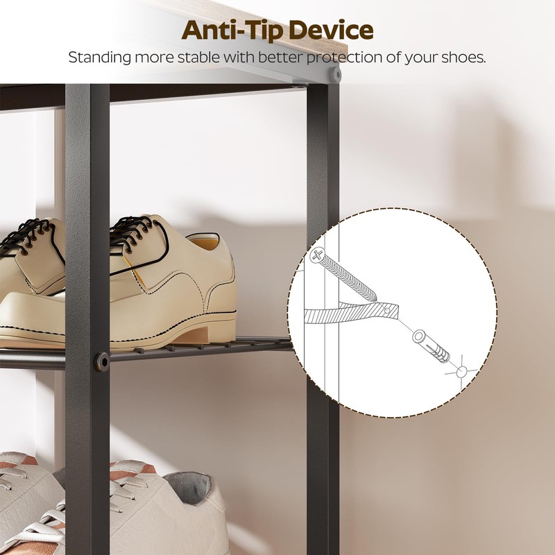 - Thoughtful Shoe Shelf: The combination of retro-finished panel and black mesh frame represents the industrial style. The multi-level design effectively stores your shoes with protection, beautiful and practical