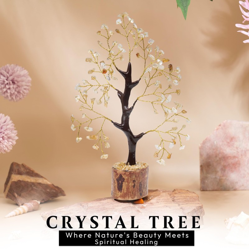 - Gemstones Tree - This crystal bonsai tree is beautifully handcrafted with energy crystals and stones with golden wire attached to the wooden base in India. The size of crystal trees is 7-8 inch approx. This gemstone tree helps to attract good luck, wealth, prosperity and abundance in your home and office.