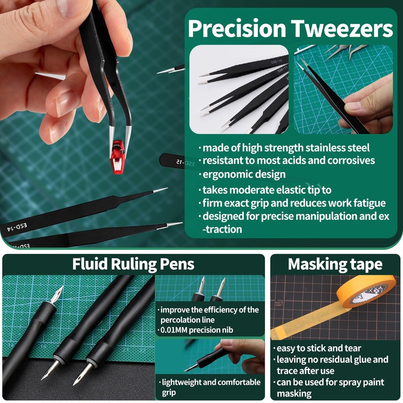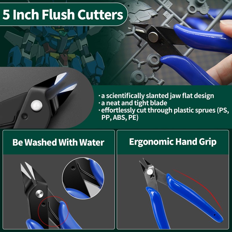 - [Multifunctional Hobby Tools Kit] The flush side cutters pliers can be used for cleanly removing exposed gates without leaving white marks; the fluid ruling pens with 0.01mm precision nib improves the efficiency of the percolation line; the mini diamond files are design for precise light work & fine accurate filing of metal. plastic, resin parts; the sanding sticks can be applied for both rough polishing and fine polishing, dry and wet polishing.