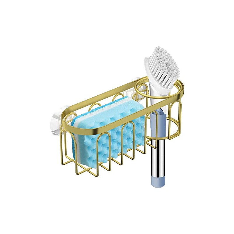 Yazoni 2-in-1 Sponge Holder for Kitchen Sink, Suction Cup Sponge Rack Kitchen Sink Caddy, No Drill Rustproof Kitchen Sink Organizer for Place Dishwashing Brush Soap and Sponge (Gold)