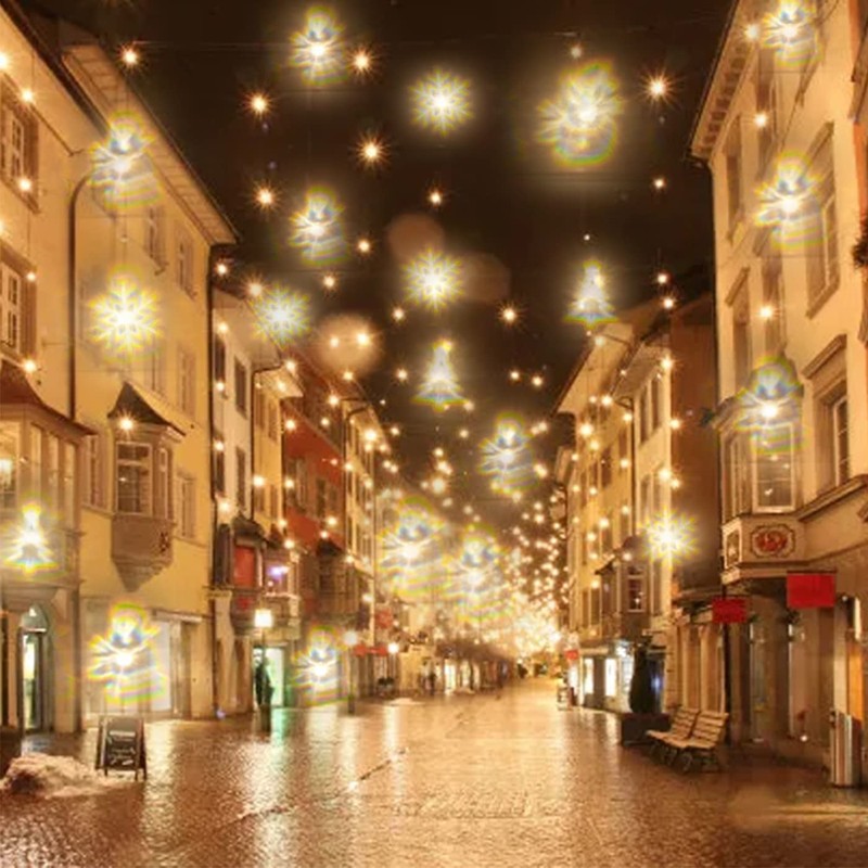 Give your eyes a surprise! When viewed through glasses, various lights miraculously transform into magical images of snowflakes, snowmen, Santa Claus and Christmas trees.