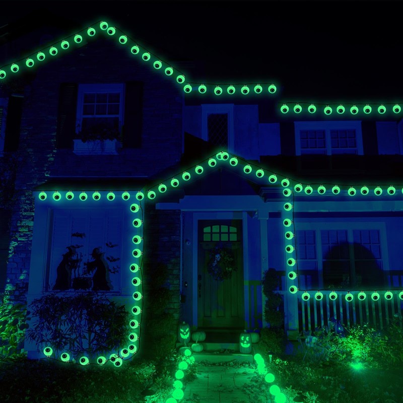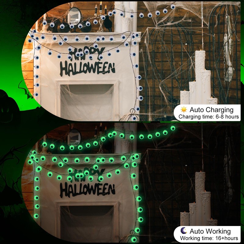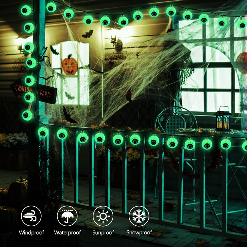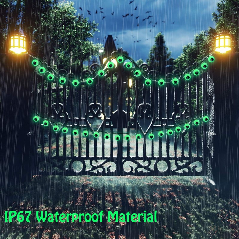 - Scary Eyeball Design: This 21.3ft solar string light features 30 LED eyeballs with blood-splattered details green color eyeball, creating an eerie, eye-catching Halloween vibe, especially at night