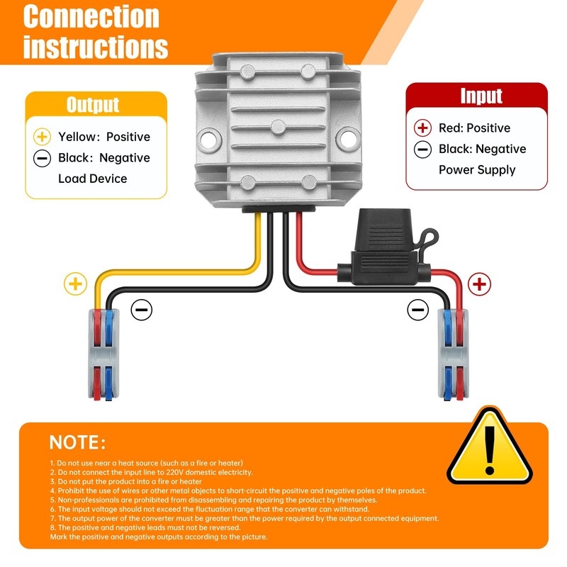 • Easy to Install: Peel the wire about 10 mm, pull of the boost key 90°MAX, insert the wire, press the boost key tightly; The converter has a red, yellow and black wire, the red and yellow are connected to the positive electrode, and the black is connected to the negative electrode