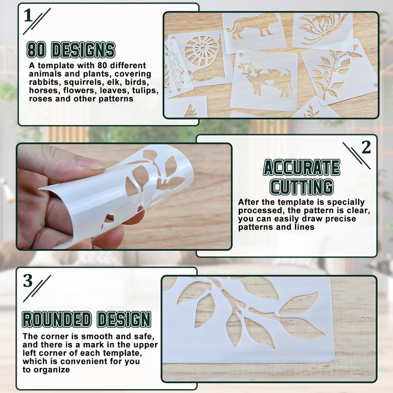 This set of animal and plant painting templates contains 80 templates with different shapes of animals and plants, each with a size of 3 inches, which is very suitable for various artwork, home projects, wall graffiti and wood painting creations. The template design is simple and clear, easy to use and can be easily mastered by both beginners and experienced artists. Each template has a marker in the upper left corner for easy organisation.