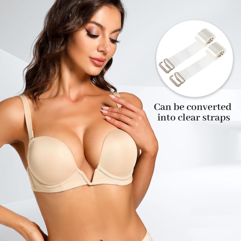 YBCG Plunge Bra with Clear Back Straps Backless Deep V Convertible Push up Padded Add 2 Cup Low Cut Underwire for Women Nude 32C