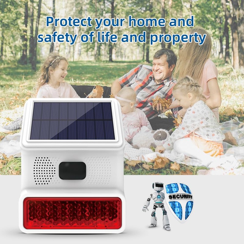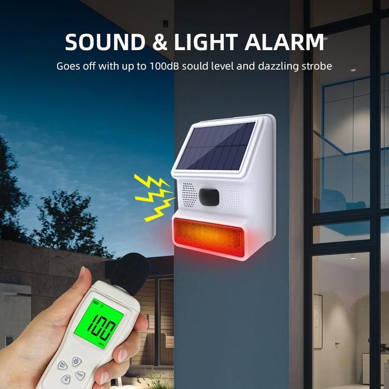 YBJ Solar Sound & Light Alarm Siren Wireless Outside Weatherproof Waterproof Alarm System with Motion Detector, Door Window Sensor, Remote Control