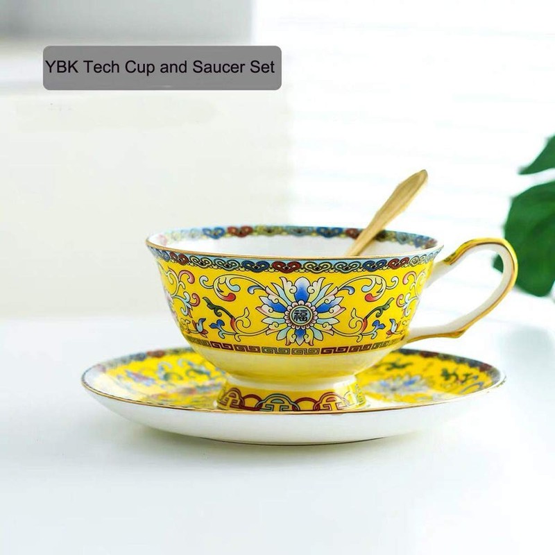 YBK Tech Cup& Saucer Set Bone China Tea Coffee Cup for Breakfast Afternoon Tea- Classic Enamel Patterns (Yellow)