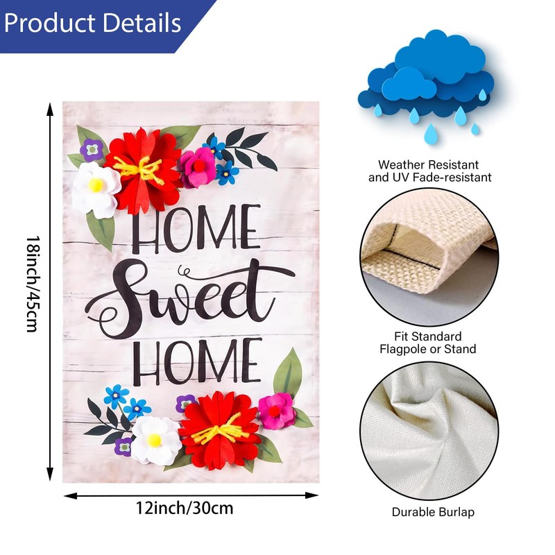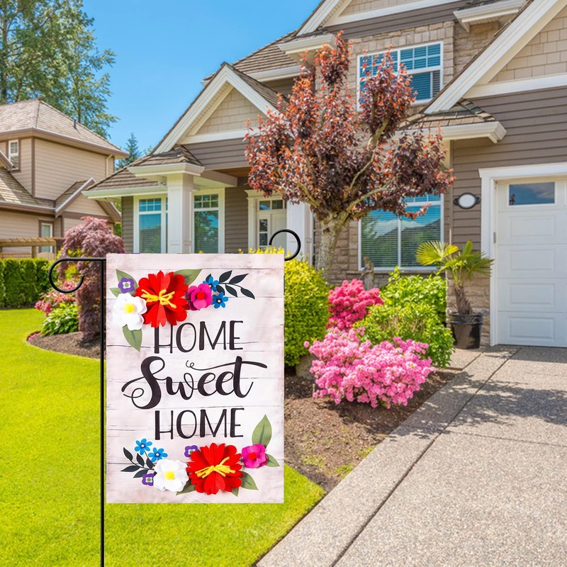- UNIQUE DETAILS: Our decorative flag is all about the details. You'll enjoy a beautiful classic flag with red flowers along the top and bottom. The flag reads "Home Sweet Home" in beautiful cursive script. This flag brings color and life to your home it shines in the sunlight. Made of fade resistant materials, you can be sure this product will last season after season!