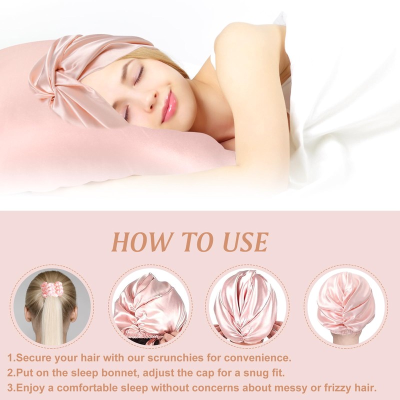 - đź‘’VERSATILE SATIN BONNET AND SCRUNCHIES SET: Our Satin Bonnet with two hair Scrunchies, it keeps hair tidy while sleeping and Suitable for hair protection after essential oil maintenance. Made from satin silk, it's a natural conditioning treatment that nourishes your hair as you sleep or care.
