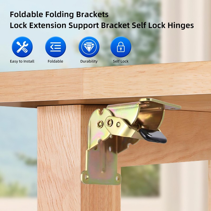 YDAJIURI Folding Brackets 4 Pack, Heavy-Duty Self-Locking Hinges with Screws, Foldable Lock Extension Support Brackets for Table Legs, Bed Legs, Workbenches – Gold