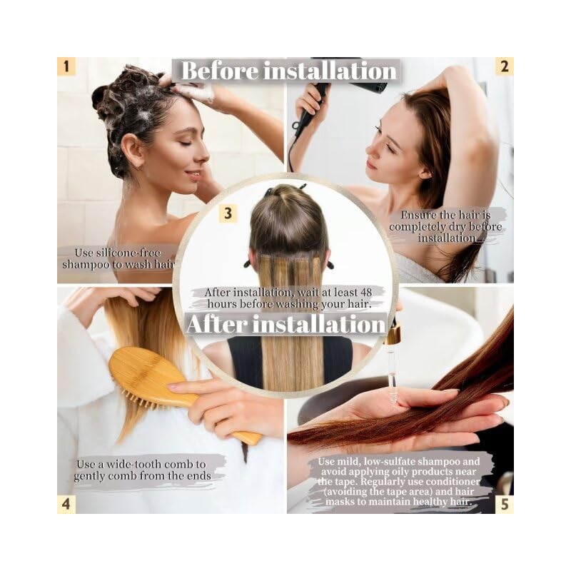 - Advantages: Easy to put in and remove. After using tape-in real hair extensions, you can straighten it, curl, colour, bleach and design your hairstyle as you like.