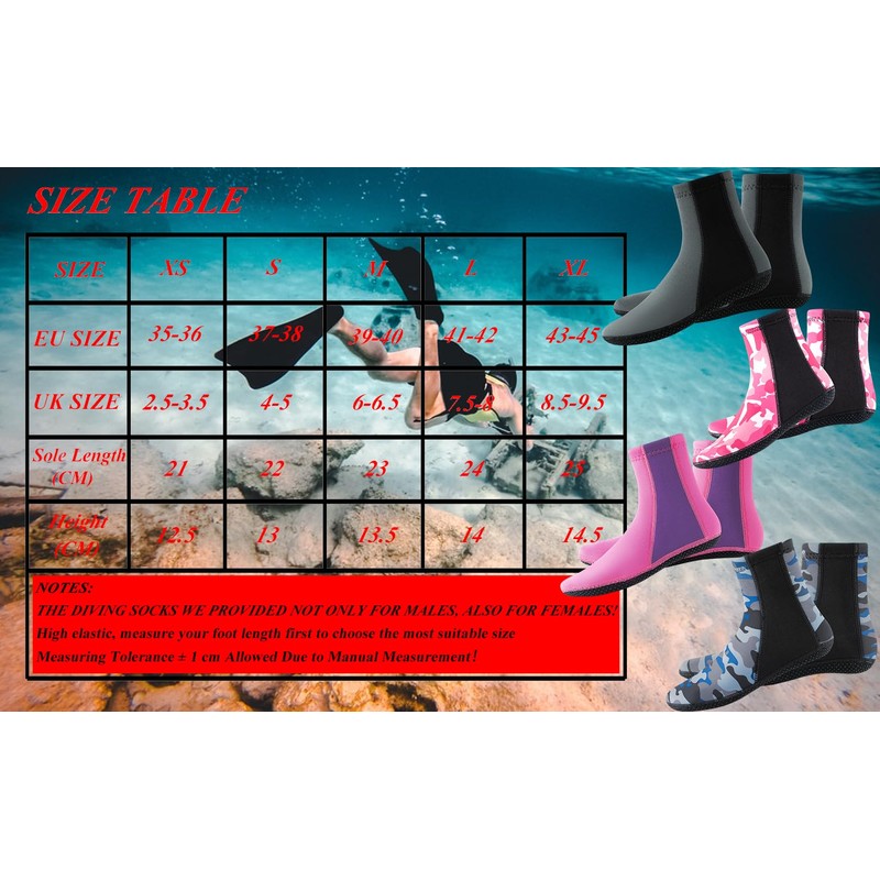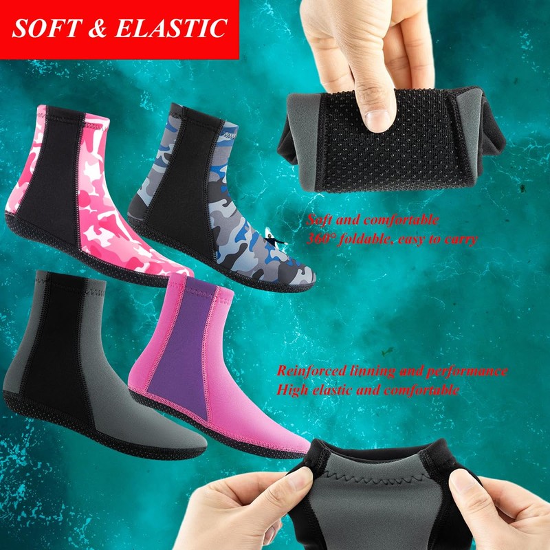 - COMFORTABLE FIT: The soft and stretch 3mm neoprene materials of the camouflage diving socks can give you flexibility and a comfortable fit, allowing you to reduce restraint and relieve foot fatigue when diving or snorkelling. The elastic at the top of the dive sock is designed to hold it in place well. All seams on neoprene socks are glued and blind stitched to ensure minimal water ingress and a snug fit.