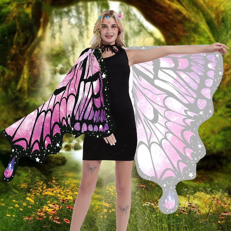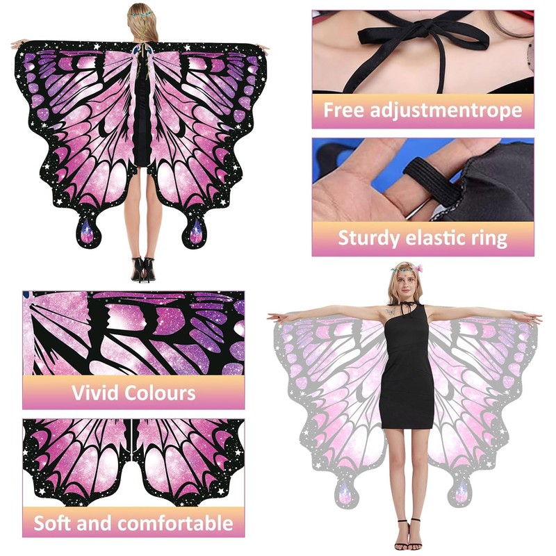 - Lightweight butterfly wings women's design: our women's butterfly costume is colourful and made of soft, skin-friendly and breathable chiffon fabric. Women wear these butterfly capes, beat your wings like a fairy to show movement and beauty, perfectly reflect the delicacy and spirit of butterfly wings, be a butterfly fairy.