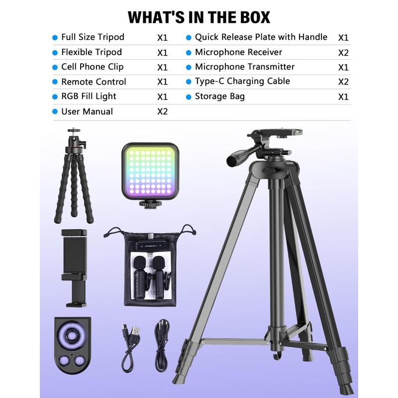 - Adjustable Phone Clamp&Bluetooth Remote: The phone holder fits phones ranging from 4.7 to 7 inches, compatible with iPhone and Android devices. It offers 360 rotation and 360 tilt, allowing you to capture photos and videos from any angle. The remote charges effortlessly through a Type-C port and pairs seamlessly with your device via Bluetooth, offering a connection range of up to 33 feet. YouTube starter kit includesCamera Tripod*1, Flexible Tripod*1, Cell Phone Clip*1, Remote Control*1, Quick Release Plate with Handle*1, RGB Fill Light*1, Microphone Receiver*2, Microphone Transmitter*1, Type-C Charging Cable*2, Storage Bag*1, User Manual*2