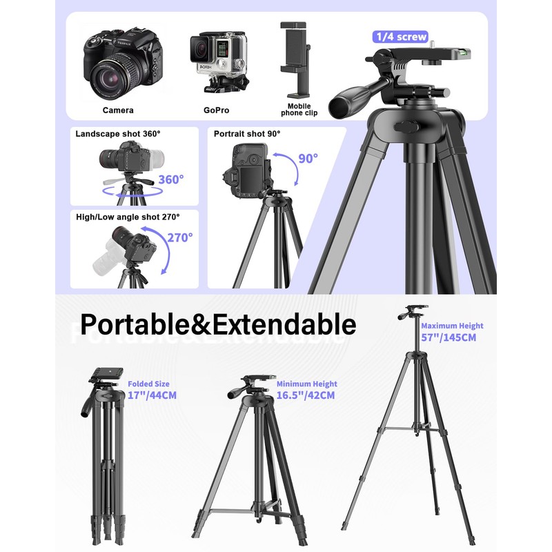 - Versatile Tripod for Every Shot: Designed for ultimate stability and ease of use, this extendable camera tripod lets you capture smooth, steady shots from ground level to eye-level perspectives. Its adjustable legs and quick-release plate make setup and adjustments a breeze, perfect for dynamic shooting scenarios. With a 1/4" screw nut, it seamlessly integrates with a wide range of devices, including phone clamps, cameras, and more, making it a versatile addition to your vlogging toolkit