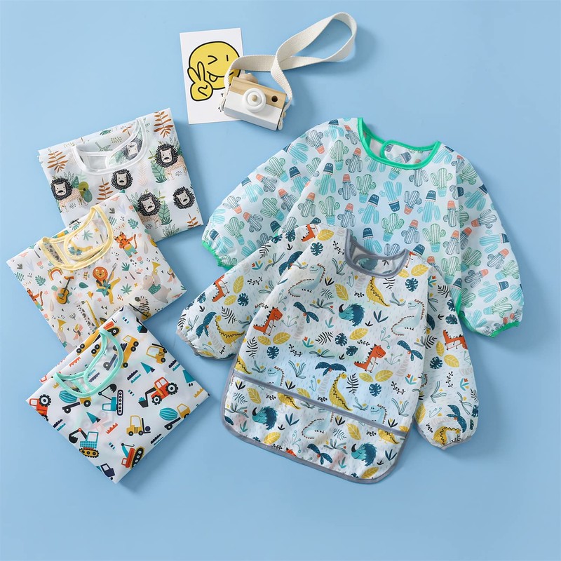 Yealoo Pack of 5 Bibs with Sleeves Baby Bibs Waterproof Washable Sleeve Bibs 6-30 Months, Excavator/Dino/Lion/Cactus/Concert