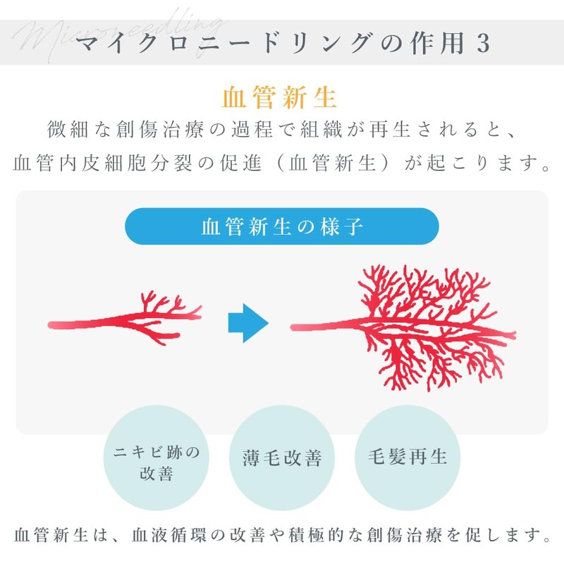 - * 【「医療」の世界から「美容」の世界へ】肌を再生するためには、グロースファクター(細胞増殖因子)をそれぞれの箇所に作用させなければなりません。そのために鍼や注射で通り道を作り、EGFやFGF等を直接必要な箇所へ届かせます。グロースファクターは、真皮や表皮で健康的で新しい細胞を生み、綺麗な肌へと育っていきます。
