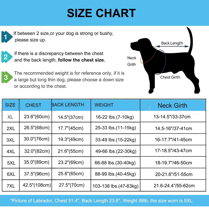 Remarks: The dog model in the picture is wearing size 5XL, weight 35 kg, chest circumference 81.9 cm.