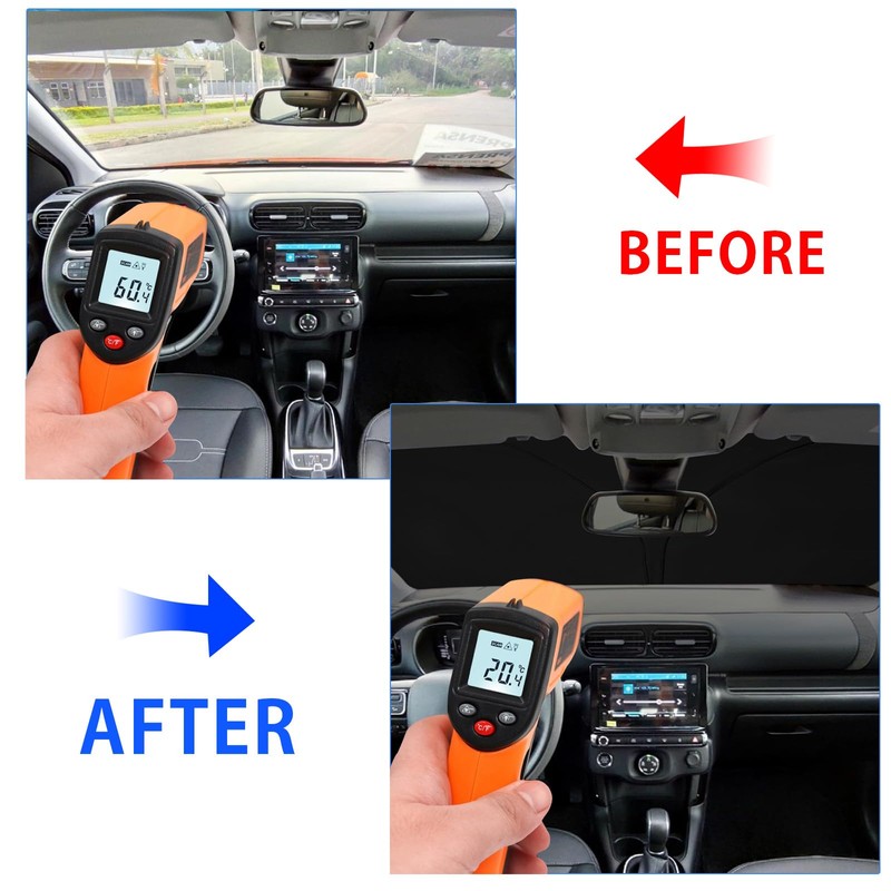 - Hält das Fahrzeug kühl: Experimente haben gezeigt, dass die Verwendung dieses Sonnenschutzes die Temperatur im Auto um 10 bis 25 Grad senken kann. Halten Sie die Temperatur in Ihrem Innenraum niedrig, um die Materialien vor dem Abbau zu schützen und die Ausgasung zu reduzieren.