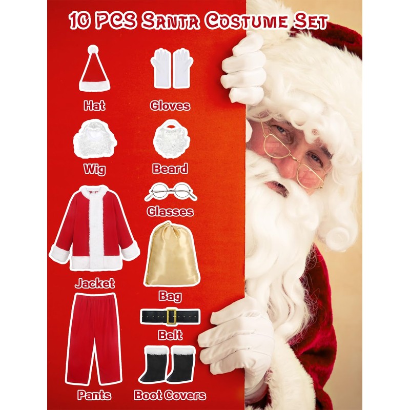 - Complete 10PCS Men’s Christmas Claus Costume Set: Transform into the beloved Christmas holiday icon with our adult Santa suit set for men. It includes a red pullover jacket, Santa pants with an elastic waistband, a black belt with a metal buckle, a classic Santa hat with fur trim and pom-pom, a white wig and beard, white gloves, glasses, black faux leather boot covers with fur cuffs, a gold gift bag, and a bell. This Santa set has everything you need for the perfect Santa look.
