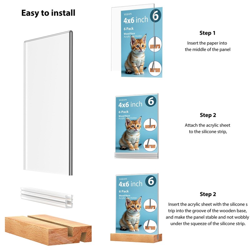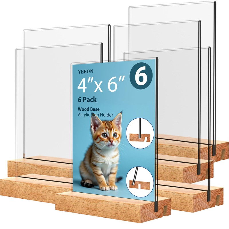 YEEON Acrylic Sign Holder with Wooden Base, Desktop Display Stand (4x6 6Pack)
