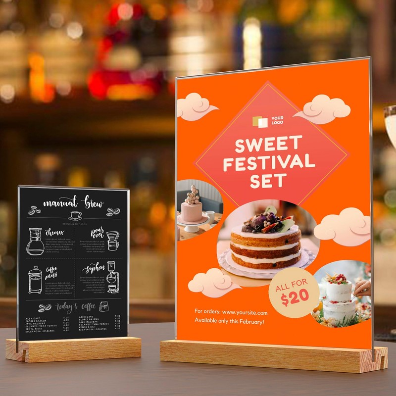 - VERSATILE DISPLAY: Clear acrylic panel with sturdy wooden base perfect for showcasing menus, photos, announcements, or promotional materials on any desk or counter