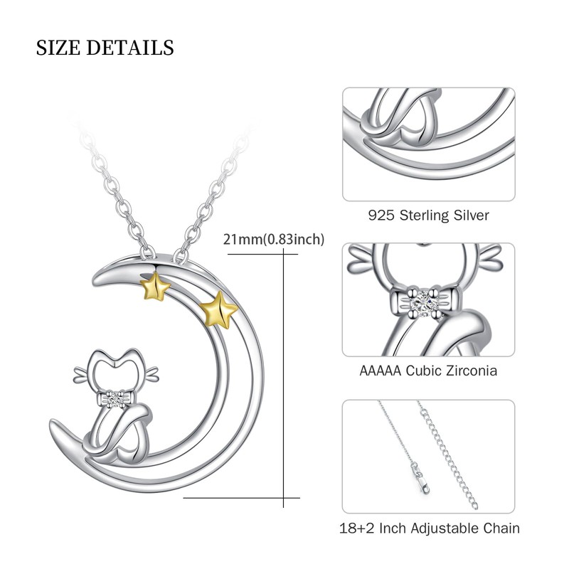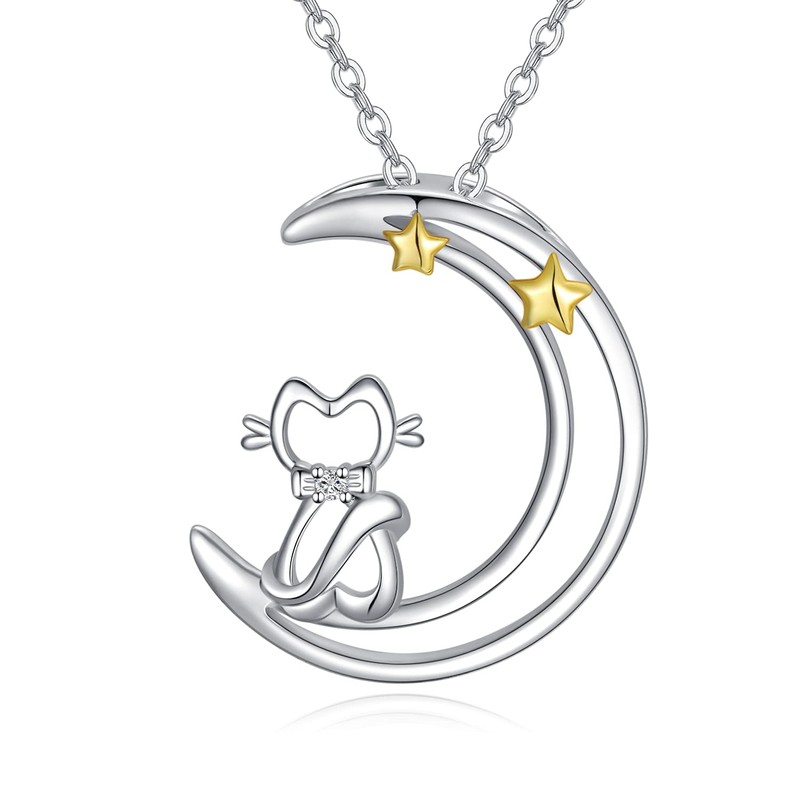 YEESIA Cat Necklace Sterling Silver Kitty Cat Necklace Crescent Moon Cat Pendant Necklace Gifts for Women Girls, Sterling Silver, Cubic Zirconia