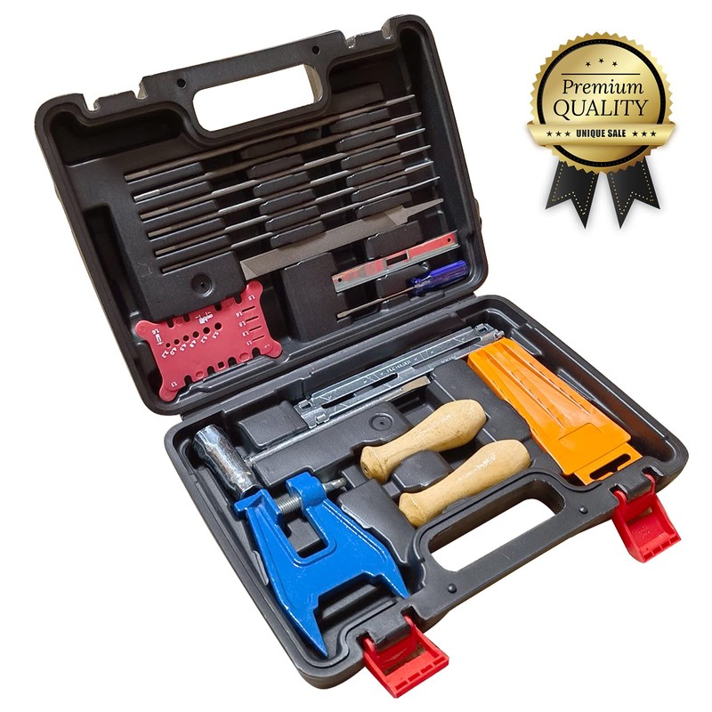• What You Get: (1) carrying case for tools -(1) T - wrench -(1) stump filing vise -(2) Hardwood handle - (1) Flat fine-tooth file - (1) screwdriver - (1) Filing guide– (1) Depth-gauge tool - and (6) round fine-tooth files in the following sizes: 5/32”, 3/16”, and 7/32” and other tools