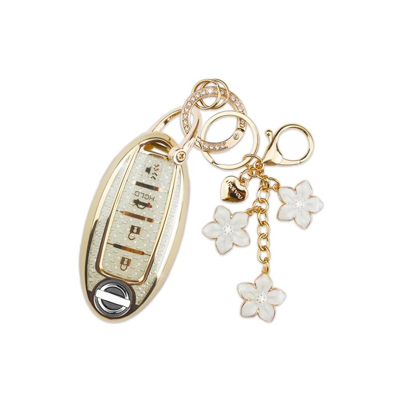 Yekoubo White TPU Key Fob Cover with Sakura Flower Keychain Compatible with Nissan Altima Murano Sentra Rogue Pathfinder Armada Leaf Titan Maxima Kicks Versa 370Z 4-Button Smart Key for Women