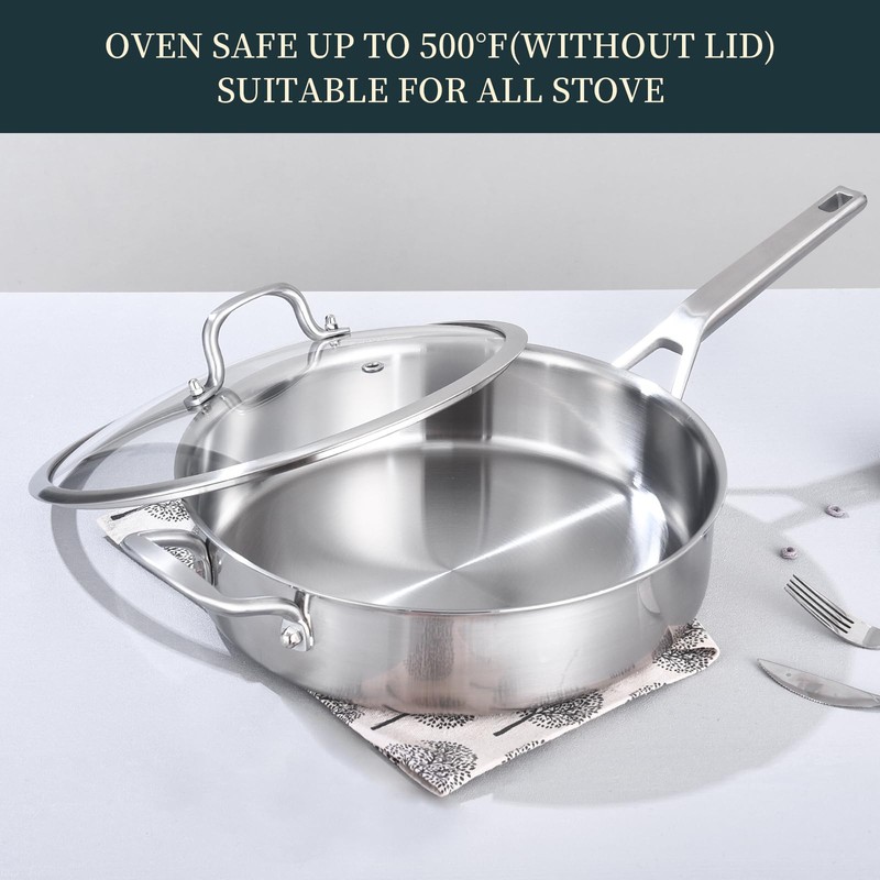 Yeksum 3-Quart Saute Pan with Lid | 10-Inch 3-Ply 18/10 Stainless Steel Deep Fry Pan & Large Skillet, Healthy Non-Toxic Cookware, Oven Safe 600°F & Dishwasher Safe