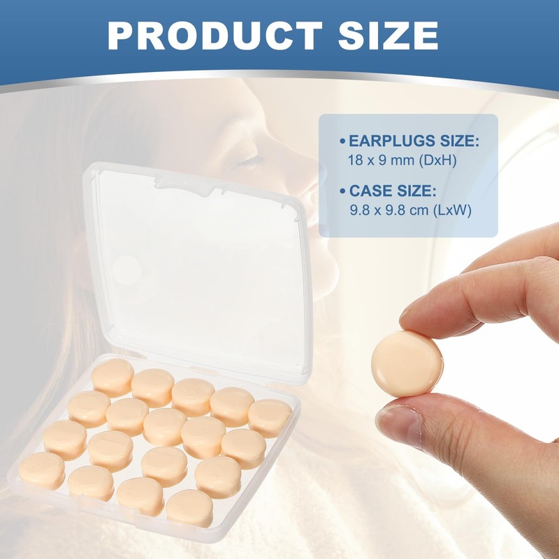 • PARCEL CONTENT- Color: Skin Tone; Material: Silicone; Earplugs Size: 18 x 9 mm/ 0.7 x 0.35 inch (DxH); Case Size: Case Size: 9.8 x 9.8 cm/ 3.86 x 3.86 inch (LXW); Noise Reduction Level: 27dB; Package Content: 20 Pack x Earplugs for Sleep