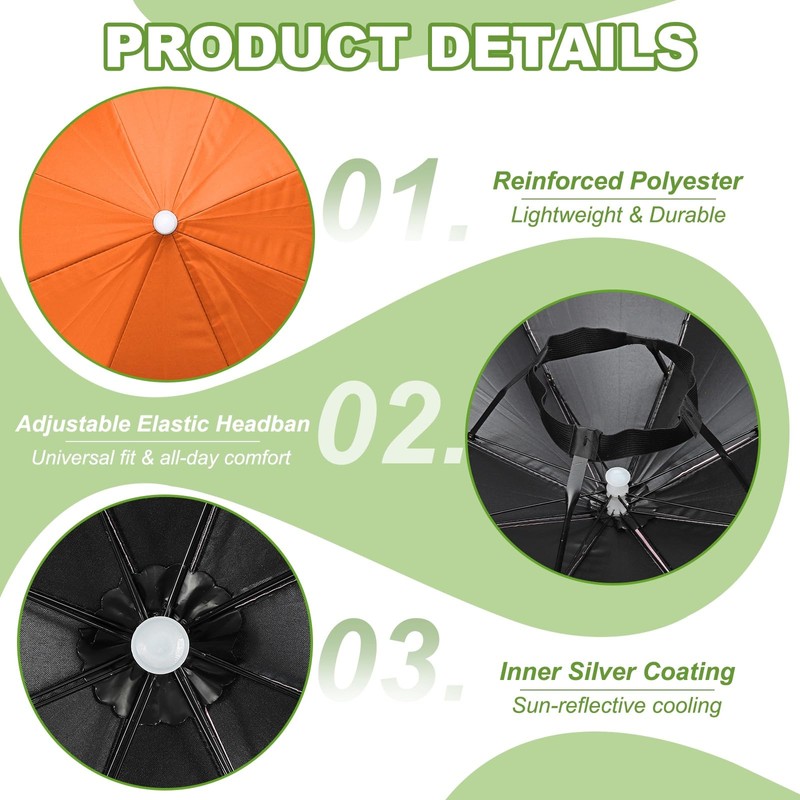 - DURABLE MATERIAL - This umbrella hat features lightweight yet durable polyester fabric with a reinforced outer layer for enhanced longevity. The innovative inner silver coating not only reflects sunlight to keep you cool but also provides sun protection. Designed for all-day comfort, its quick-drying and wind-resistant construction delivers sun and rain protection when you need it most.