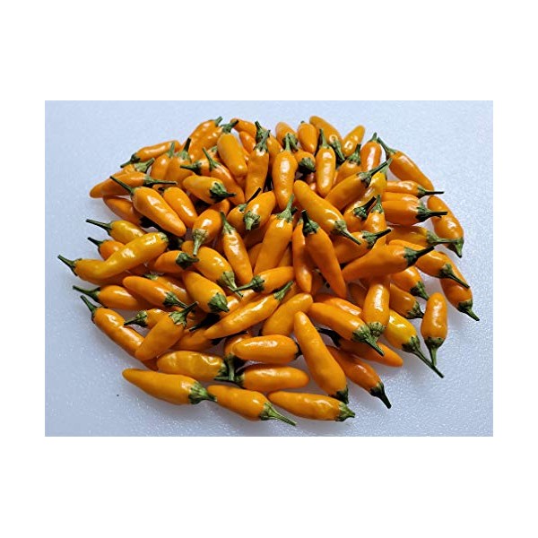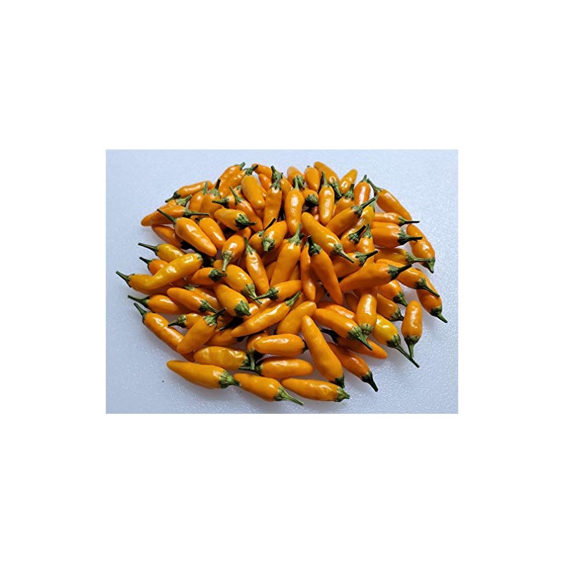 Yellow Pequin-(Capsicum annuum)-I can say with all confidence that the Yellow Pequin pepper as of 2018 is the rarest pepper to come out of Mexico. The popular Pequin is always red when ripe and nobody has seen the yellow recessive gene appear until now. So now Mexico has a small bird type that rivals the flavor of the famous Aji Charapita. It too has sweet citrus tones like the Charapita. But it grows into a bigger bush and is more productive. The Yellow Pequin originated in the state of Queretaro, Mexico, in the small town of San Miguel Palmas. This is a semi-desert area in central Mexico. It was discovered by a man name Jeronimo Hernandez, also known as "Chucho." There is a red Pequin that grows in the wild in this area. Jeronimo has grown the Chile Pequin from these wild peppers in his home garden for his whole life and one of the plants ended up producing yellow fruit, which is extremely rare. About six years ago, he sent seed from this plant to his son who lives in South Carolina. His son also a farmer grew this out year after year under isolation netting and it stayed yellow. The Yellow Pequin tend to grow bigger than in the wild. This is due to more nutrients and water the plants get than in the wild. However, the peppers still have the same great flavor. The Yellow Pequin chile plants grow over 4 feet tall.