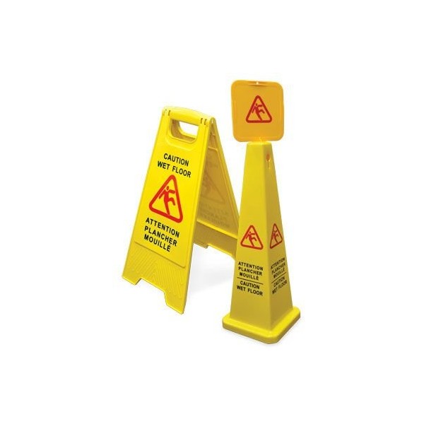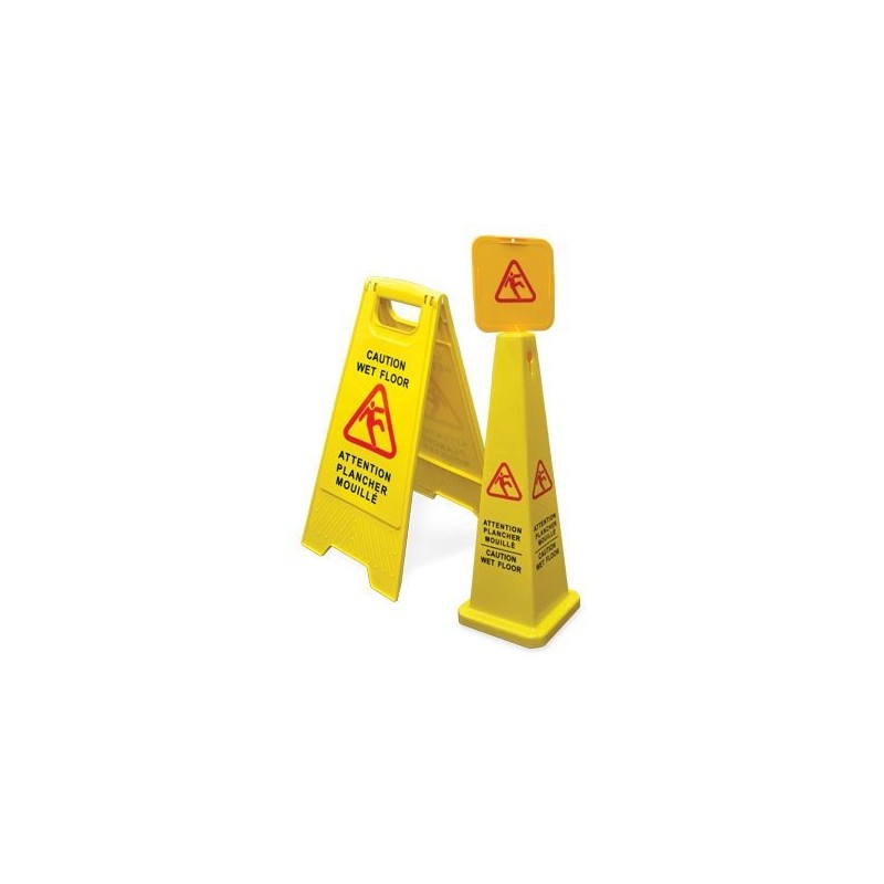 - The "A" shaped caution sign is made from molded plastic with a built in handle that makes it easy to move around. The sign displays a clear warning message on both sides. The four sided cone-shaped wet floor sign clearly displays the warning message on all sides. The top of the cone will accommodate a sign that locks in place.