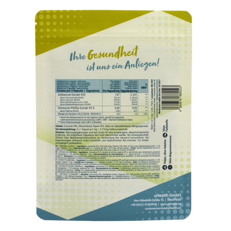 - 750 mg curcumin 95% UV + 3mg piperine 95%